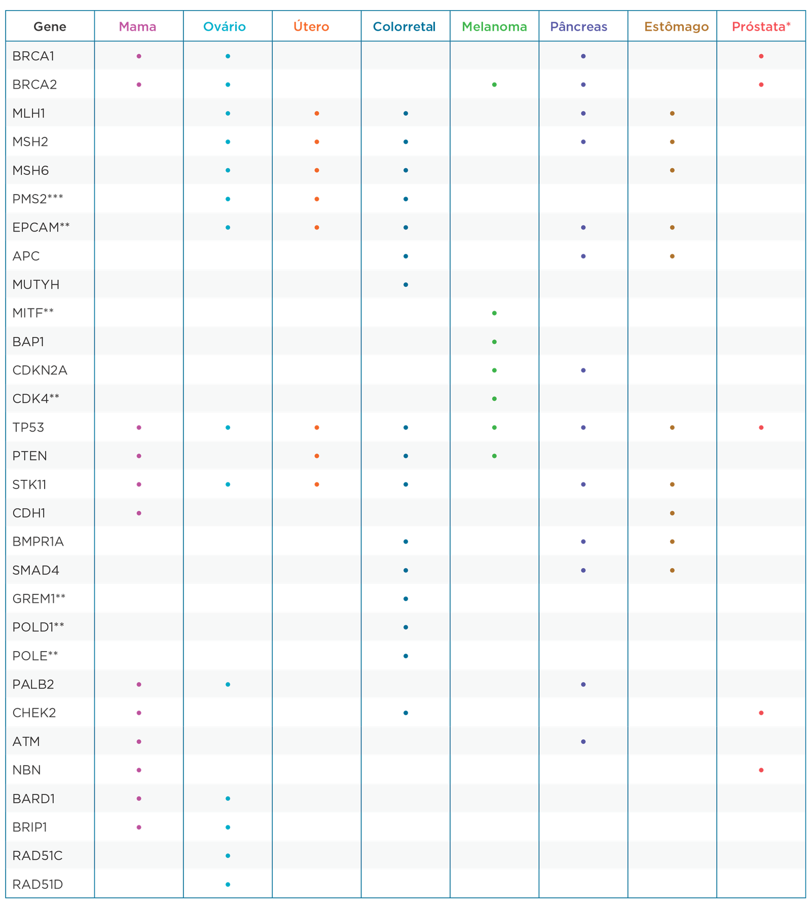 ** São analisadas apenas posições que conhecidamente impactam o risco de câncer: CDK4: apenas chr12:g.58145429-58145431 (códon 24) é analisado, EPCAM: apenas grandes deleções e duplicações, incluindo a extremidade 3’ do gene, são analisadas, GREM1: apenas duplicações na região reguladora a montante são analisadas, MITF: apenas chr3:g.70014091 (incluindo c.952G>A) é analisado, POLD1: apenas chr19:g.50909713 (incluindo c.1433G>A) é analisado, POLE: apenas chr12:g.133250250 (incluindo c.1270C>G) é analisado.